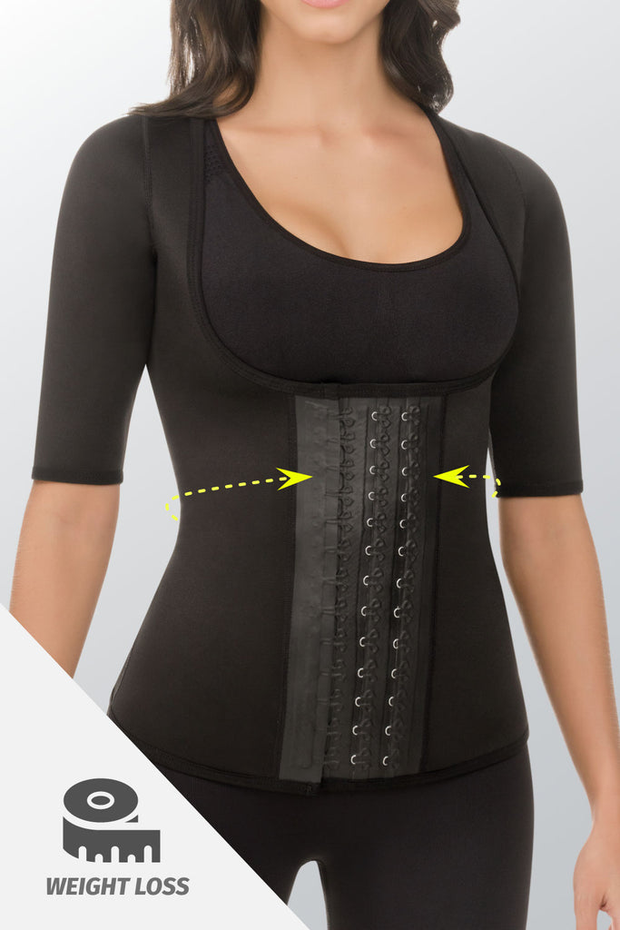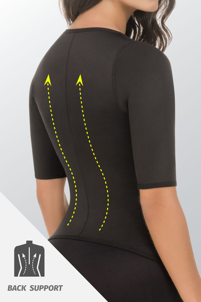 The Ultra Sweat sleeves vest allows for a fat-melting effect on your midsection. Its elements will help you to have the correct support, due to its wide shoulder straps, the avant-garde open bust design, and full coverage of the back and the front closure. In addition to applying an ultra compression and a thermal layer that will help you regulate blood flow!